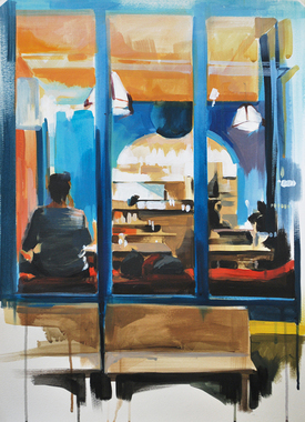 Un café con leche en Madrid, 2019, Oil and aerosol on canvas, 81 × 100 cm